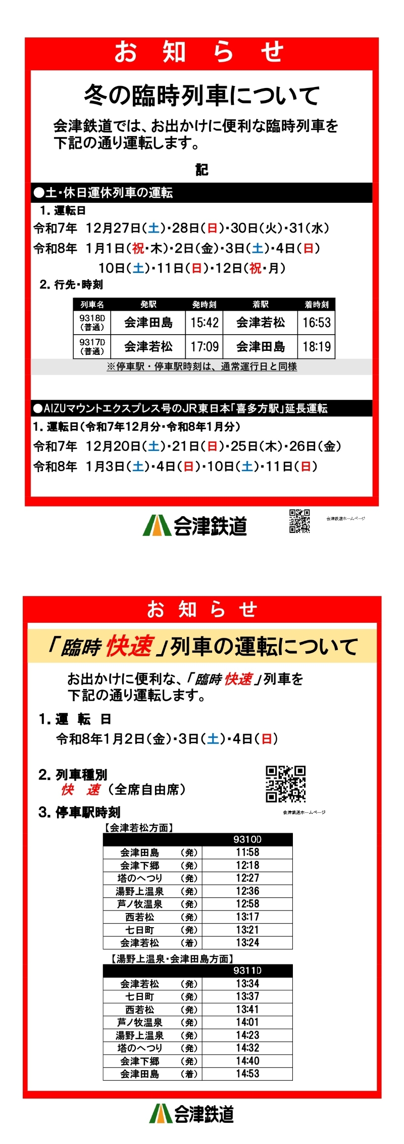 冬の臨時列車について