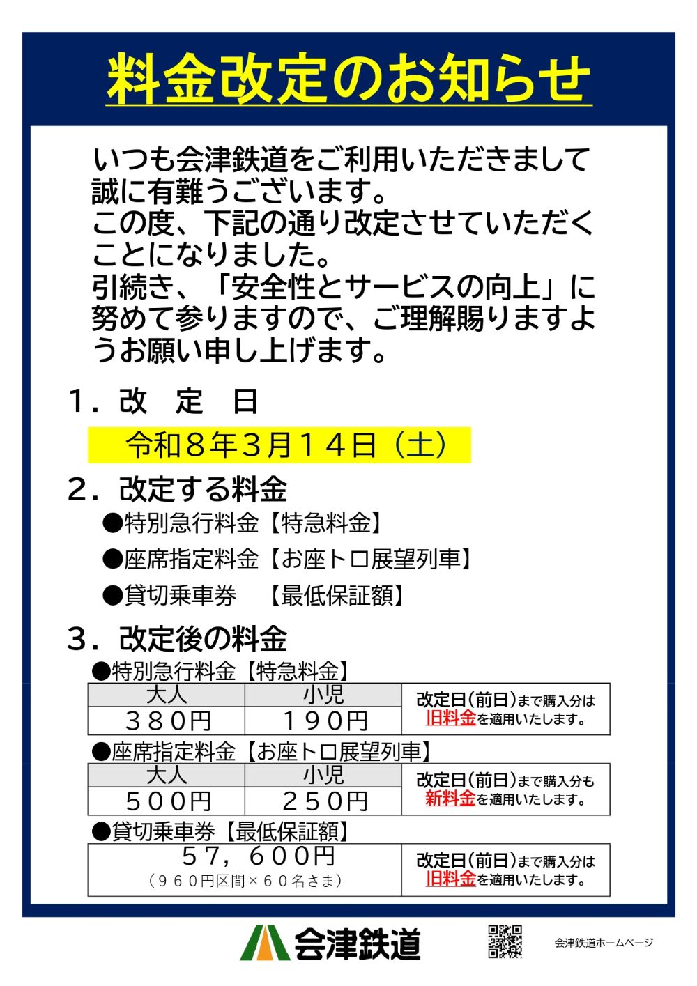 3/14日 料金等改定のお知らせ